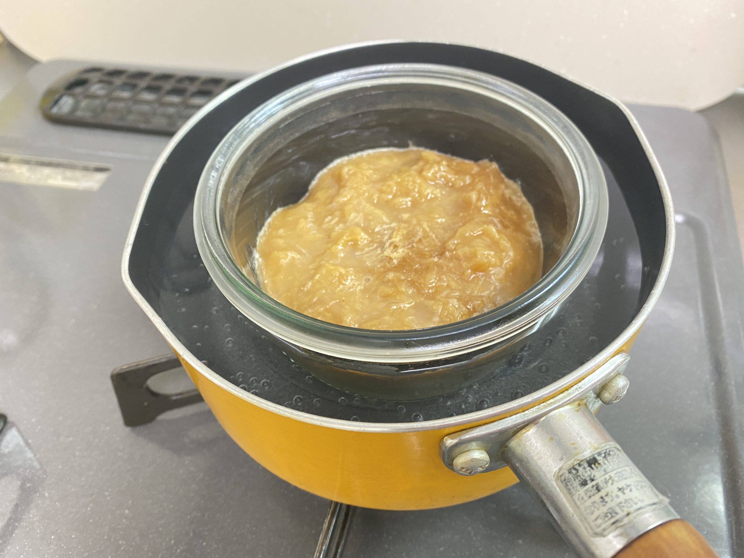 このままでは容器ごとほかさなきゃいけなくなりそう?温めると溶けるかな?と、とりあえずグツグツと湯煎♨️