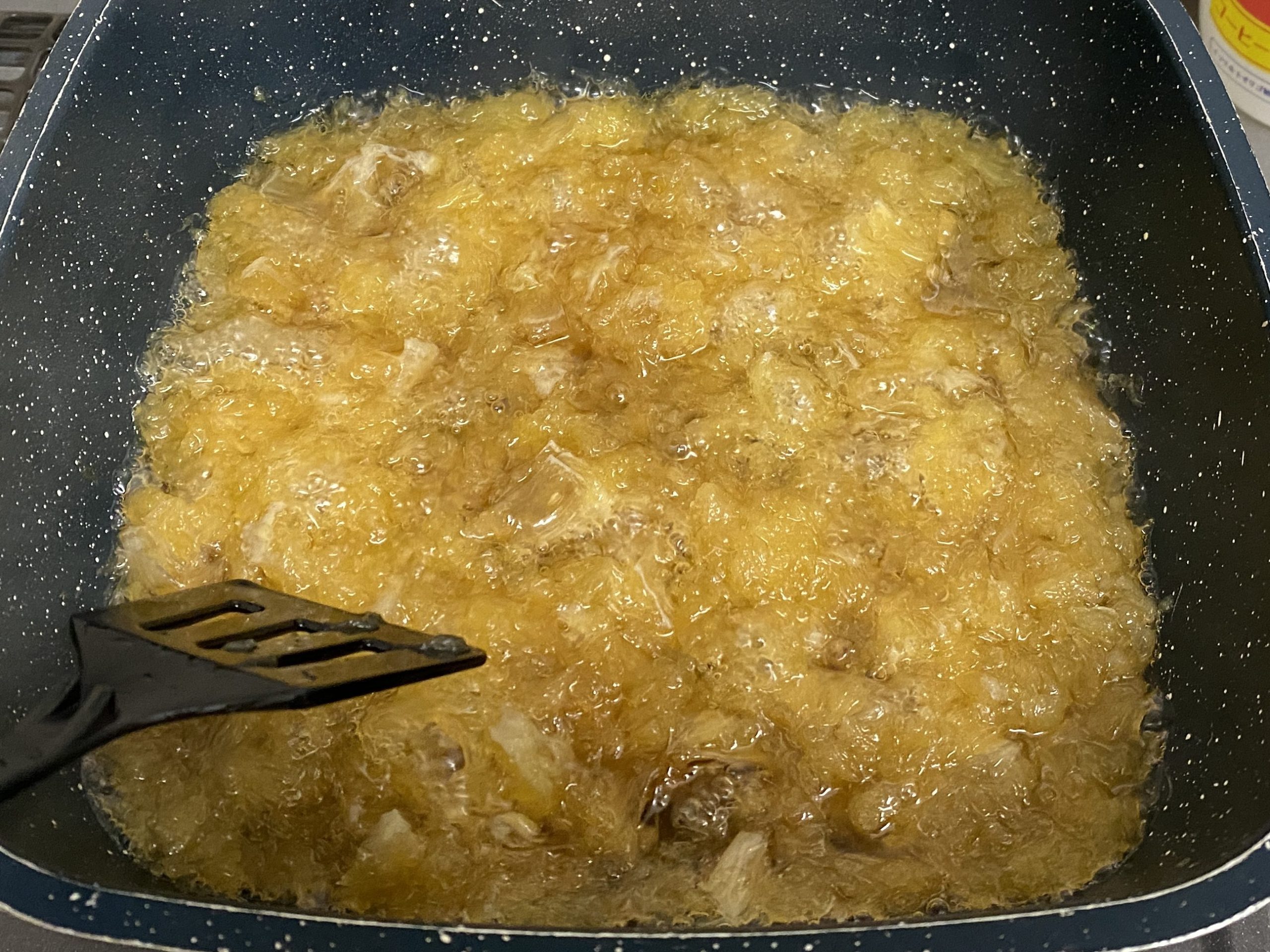もしかして50mlは多かったのかな?まぁどのみち水分飛んでいくからいいやと、弱火で焦がさないようグツグツ。