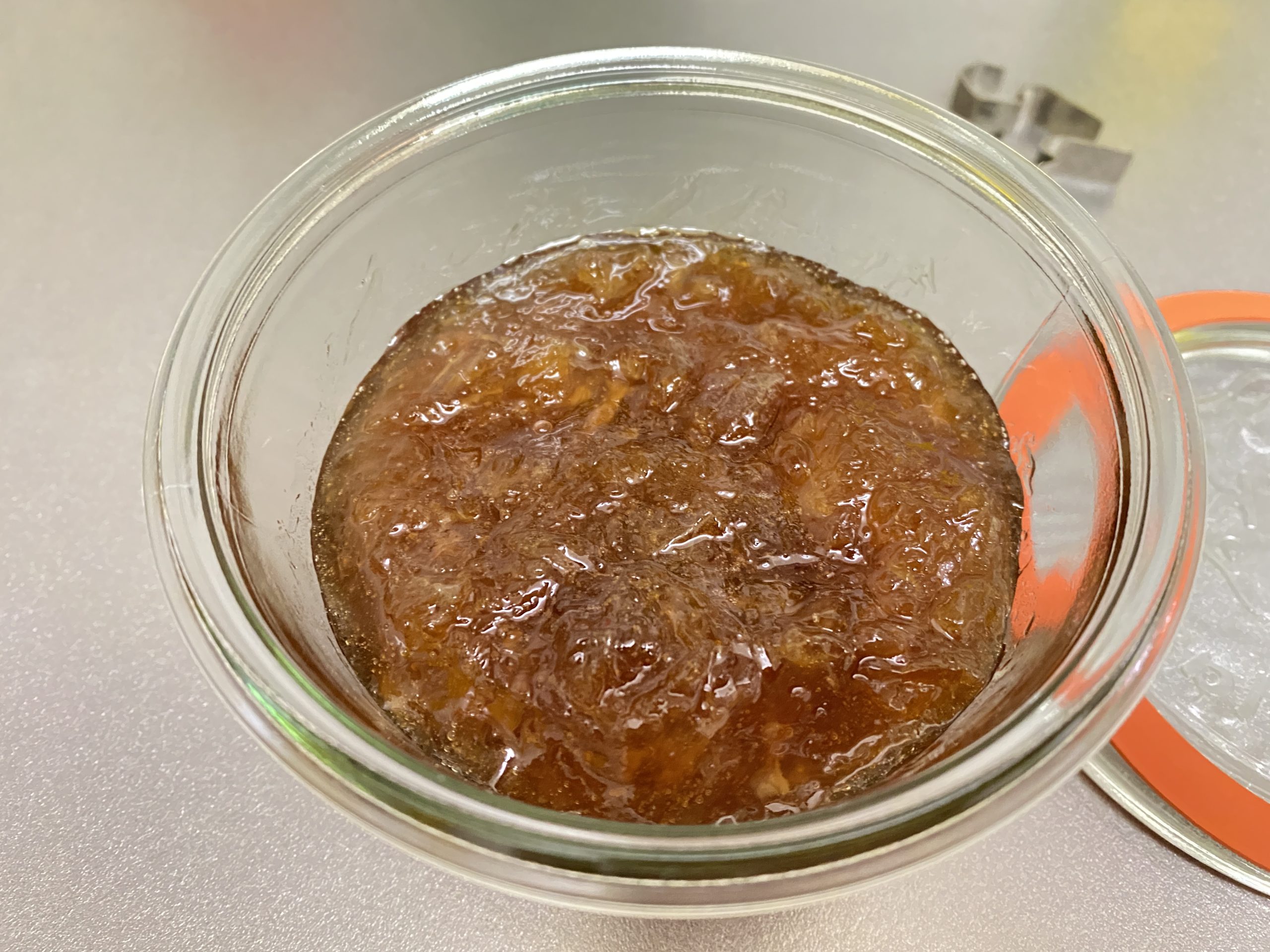 ラカントで作ったからなのか、焦がしてはいないのにグツグツ煮込んでいくうちに茶色っぽくなり、仕上がりは完全に茶色いレモンジャムになりました。